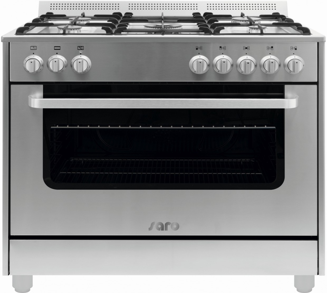 Plynový sporák, pro použití v lehkých provozech, s pěti hořáky 1 x 1 kW, 2 x 1,75 kW, 1 x 3 kW ,1 x WOK 4,25 kW. Horkovzdušná trouba 115 litrů, gril 1,8 kW. Časovač. Vnitřní rozměr trouby 760 x 470 x 400 mm.