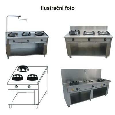 Profesionální plynový sporák Casta, otevřená podestavba. Čínské sporáky Casta jsou vyráběny přesně dle požadavků zákazníků přímo na míru. Výběr libovolných atmosférických hořáků s vertikálním plamenem bez vlivu na cenu: C 9,5 kW; T 14 kW; S 21 kW. Dále je možné za příplatek instalovat infračervený hořák B 23 kW (regulace 18-23 kW, požadováno navíc el.připojení 230V). Další variantou bez vlivu na cenu je možnost zvolit libovolnou kombinaci čínských výkonných hořáků s tradičními evropskými litinovými hořáky: P 3 kW; M 4,5 kW; G 7,5 kW - MODELY EURASIA. Konstrukce varné části z AISI 304 25/10 chrom-niklové oceli. Sporáky mohou být za příplatek vybaveny různými čistícími systémy dle přání zákazníka. Dále mohou být vybaveny vodovodními kohoutky s různým ovládáním. Možnost dodání sporáků bez podestavby, na otevřené nebo uzavřené (posuvná dvířka) podestavbě, s plynovou troubou GN2/1 vybavenou termoregulací 0°C-280°C, piezzoelektrickým zapalováním a časovačem. Možnost dodání též s elektrickou horkovzdušnou troubou. Modely s 1-10 hořáky v 1 nebo 2 řadách. Ovládání hořáků z jedné strany (ke zdi) nebo z obou stran (ostrovní - Island modely). Bez vlivu na cenu lze volit provedení s lemem nebo bez lemu. Další možnosti či příslušenství na vyžádání. M=libovolná volba rozměru na míru.