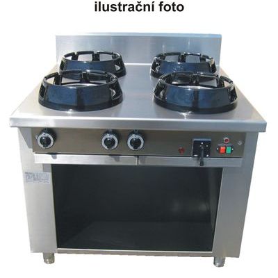 Profesionální plynový sporák Casta, otevřená podestavba. Čínské sporáky Casta jsou vyráběny přesně dle požadavků zákazníků přímo na míru. Výběr libovolných atmosférických hořáků s vertikálním plamenem bez vlivu na cenu: C 9,5 kW; T 14 kW; S 21 kW. Dále je možné za příplatek instalovat infračervený hořák B 23 kW (regulace 18-23 kW, požadováno navíc el.připojení 230V). Další variantou bez vlivu na cenu je možnost zvolit libovolnou kombinaci čínských výkonných hořáků s tradičními evropskými litinovými hořáky: P 3 kW; M 4,5 kW; G 7,5 kW - MODELY EURASIA. Konstrukce varné části z AISI 304 25/10 chrom-niklové oceli. Sporáky mohou být za příplatek vybaveny různými čistícími systémy dle přání zákazníka. Dále mohou být vybaveny vodovodními kohoutky s různým ovládáním. Možnost dodání sporáků bez podestavby, na otevřené nebo uzavřené (posuvná dvířka) podestavbě, s plynovou troubou GN2/1 vybavenou termoregulací 0°C-280°C, piezzoelektrickým zapalováním a časovačem. Možnost dodání též s elektrickou horkovzdušnou troubou. Modely s 1-10 hořáky v 1 nebo 2 řadách. Ovládání hořáků z jedné strany (ke zdi) nebo z obou stran (ostrovní - Island modely). Bez vlivu na cenu lze volit provedení s lemem nebo bez lemu. Další možnosti či příslušenství na vyžádání.