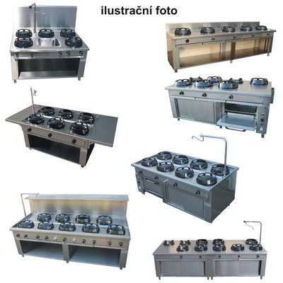 Profesionální plynový sporák Casta, otevřená podestavba. Čínské sporáky Casta jsou vyráběny přesně dle požadavků zákazníků přímo na míru. Výběr libovolných atmosférických hořáků s vertikálním plamenem bez vlivu na cenu: C 9,5 kW; T 14 kW; S 21 kW. Dále je možné za příplatek instalovat infračervený hořák B 23 kW (regulace 18-23 kW, požadováno navíc el.připojení 230V). Další variantou bez vlivu na cenu je možnost zvolit libovolnou kombinaci čínských výkonných hořáků s tradičními evropskými litinovými hořáky: P 3 kW; M 4,5 kW; G 7,5 kW - MODELY EURASIA. Konstrukce varné části z AISI 304 25/10 chrom-niklové oceli. Sporáky mohou být za příplatek vybaveny různými čistícími systémy dle přání zákazníka. Dále mohou být vybaveny vodovodními kohoutky s různým ovládáním. Možnost dodání sporáků bez podestavby, na otevřené nebo uzavřené (posuvná dvířka) podestavbě, s plynovou troubou GN2/1 vybavenou termoregulací 0°C-280°C, piezzoelektrickým zapalováním a časovačem. Možnost dodání též s elektrickou horkovzdušnou troubou. Modely s 1-10 hořáky v 1 nebo 2 řadách. Ovládání hořáků z jedné strany (ke zdi) nebo z obou stran (ostrovní - Island modely). Bez vlivu na cenu lze volit provedení s lemem nebo bez lemu. Další možnosti či příslušenství na vyžádání. M=libovolná volba rozměru na míru.