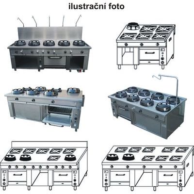 Profesionální plynový sporák Casta, s plynovou troubou GN2/1 vybavenou termoregulací 0°C-280°C, piezzoelektrickým zapalováním a časovačem. Čínské sporáky Casta jsou vyráběny přesně dle požadavků zákazníků přímo na míru. Výběr libovolných atmosférických hořáků s vertikálním plamenem bez vlivu na cenu: C 9,5 kW; T 14 kW; S 21 kW. Dále je možné za příplatek instalovat infračervený hořák B 23 kW (regulace 18-23 kW, požadováno navíc el.připojení 230V). Další variantou bez vlivu na cenu je možnost zvolit libovolnou kombinaci čínských výkonných hořáků s tradičními evropskými litinovými hořáky: P 3 kW; M 4,5 kW; G 7,5 kW - MODELY EURASIA. Konstrukce varné části z AISI 304 25/10 chrom-niklové oceli. Sporáky mohou být za příplatek vybaveny různými čistícími systémy dle přání zákazníka. Dále mohou být vybaveny vodovodními kohoutky s různým ovládáním. Možnost dodání sporáků bez podestavby, na otevřené nebo uzavřené (posuvná dvířka) podestavbě, s plynovou troubou GN2/1 vybavenou termoregulací 0°C-280°C, piezzoelektrickým zapalováním a časovačem. Možnost dodání též s elektrickou horkovzdušnou troubou. Modely s 1-10 hořáky v 1 nebo 2 řadách. Ovládání hořáků z jedné strany (ke zdi) nebo z obou stran (ostrovní - Island modely). Bez vlivu na cenu lze volit provedení s lemem nebo bez lemu. Další možnosti či příslušenství na vyžádání. M=libovolná volba rozměru na míru.
