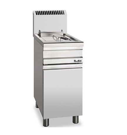 Profesionální stolní fritéza - vhodné pro všechny gastronomické provozy. Vyrobeno výhradně z nerezové oceli AISI 304 (18/10) , lisovaná nádrž z jednoho kusu v AISI 304 bez svařování se zaoblenými rohy s indikací hladiny oleje MAX-MIN , trubkové hořáky z nerezové oceli uvnitř nádrže, termostatické pojistné ventily s termočlánkem, ruční reset bezpečnostního termostatu, zapalování piezoelektrické, nastavitelná teplota v sedmi pozicích od 110 ° C do 190 ° C, připravené na zemní plyn, zahrnují i možnost pro butan / propanový plyn, zesílený koš z nerezové oceli AISI 304 (18/10), studená plocha pro sběr odpadu, nastavitelné nohy.