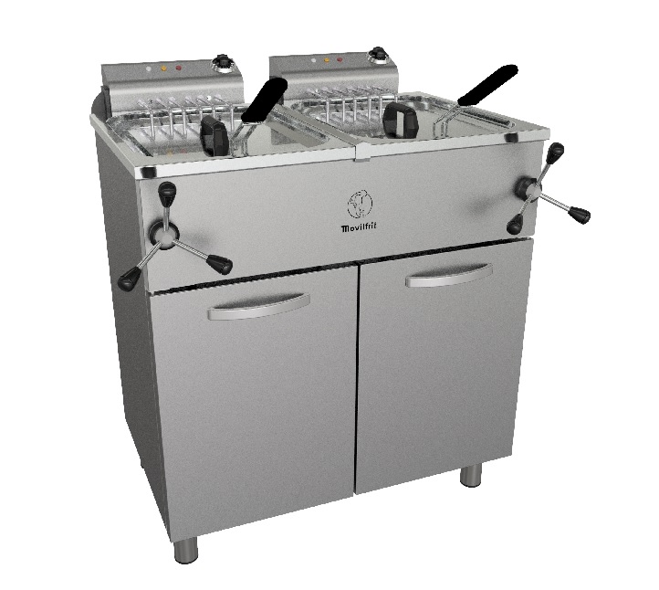 Profesionální fritéza - vhodné pro všechny gastronomické provozy. Unikátní řešení voda/olej. Skříňové provedení. Automatický zvedací systém. Vyrobeno výhradně z nerezavějící oceli AISI 304 (18/10). Tloušťka nerezové oceli 1 mm. Lisovaná nádrž z jednoho kusu v AISI 304, bez svařování a se zaoblenými rohy. Odpadový filtr ve spodní části nádrže. S odnímatelnou nádobkou pro odvodnění na spodní straně fritézy.