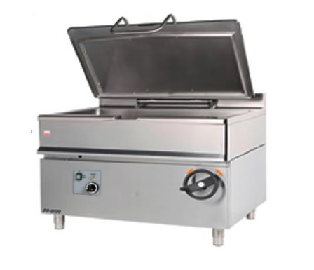 Profesionální elektrická smažící pánev. Objem 120 litrů, nerez nádoba, rozměr vany 1100x613x212 mm, ruční vyklápění, baterie na studenou vodu.