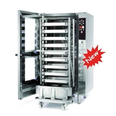 Konvektomat elektrický + zavážecí vozík, nástřik - přímá pára, kapacita 20 x GN 1 / 1, varná komora z nerezové oceli AISI 304 se zaoblenými rohy, vnější provedení z nerezové oceli AISI 304 (scotch brite), dvojité větrané sklo dveří, dvojitý zámek dveří, vnitřní halogenové světlo. Akustický alarm při ukončení vaření. Automatická redukce páry v komoře. Elektro-mechanické ovládání. Konvekční pečení 30 - 270 ° C, vaření v páře 30 - 100 ° C, vaření v kombinaci 30 ÷ 270 ° C. 2 rychlosti ventilátoru. Programovatelné - 40 programů až se sedmi kroky. Automatické mytí není součástí výrobku - volitelný prvek.