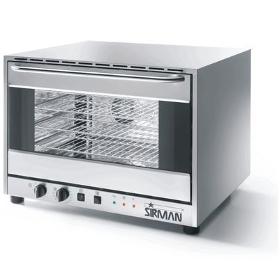 Horkovzdušná trouba - celonerezové provedení se dvěma ventilátory. 4 police, vzdálenost mezi policemi je 8 cm. Vnitřní komora se zaoblenými rohy pro snadné čištění. Dveře s dvojitým sklem. Vnitřní osvětlení se dvěma lampami. Rozvod tepla ventilátorem. Termostatem řízená teplota od 25 ° C do 300 ° C. Časovač vaření 0 až 120 minut, nebo kontinuální provoz.