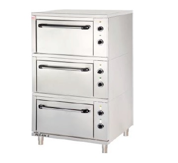 Horkovzdušná trouba statická s možností zapnutí ventilátoru - celonerezové provedení. 3 sekce, každá se třemi vsuny, vzdálenost mezi policemi je 85 mm.