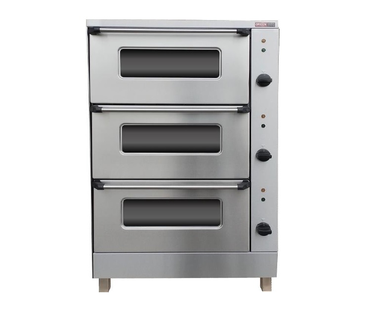 Pečící trouba statická , nerezový plášť, smaltovaný interier. 3 sekce, každá se třemi vsuny GN 2/1, vzdálenost mezi policemi je 85 mm.