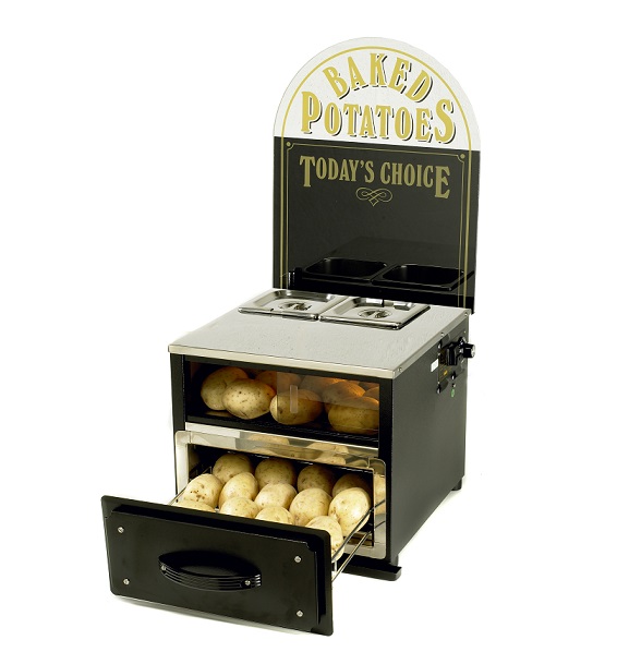 3 in 1 Potato Station - profesionální zařízení na opékání brambor. Pracovní deska osazena dvěma nádobami o objemu 3 litry pro dochucovadla a omáčky. Dvě komory, pečící a udržovací, o kapacitě 15+15 brambor. Provedení černé.