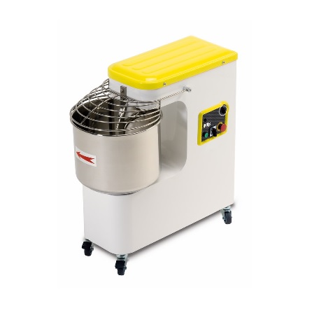 Spirálový hnětač - vyroben z masivní lakované nerezové oceli. Kolečka, časovač a mřížka-kryt nádoby. Řetězový pohon. Jedna rychlost.
