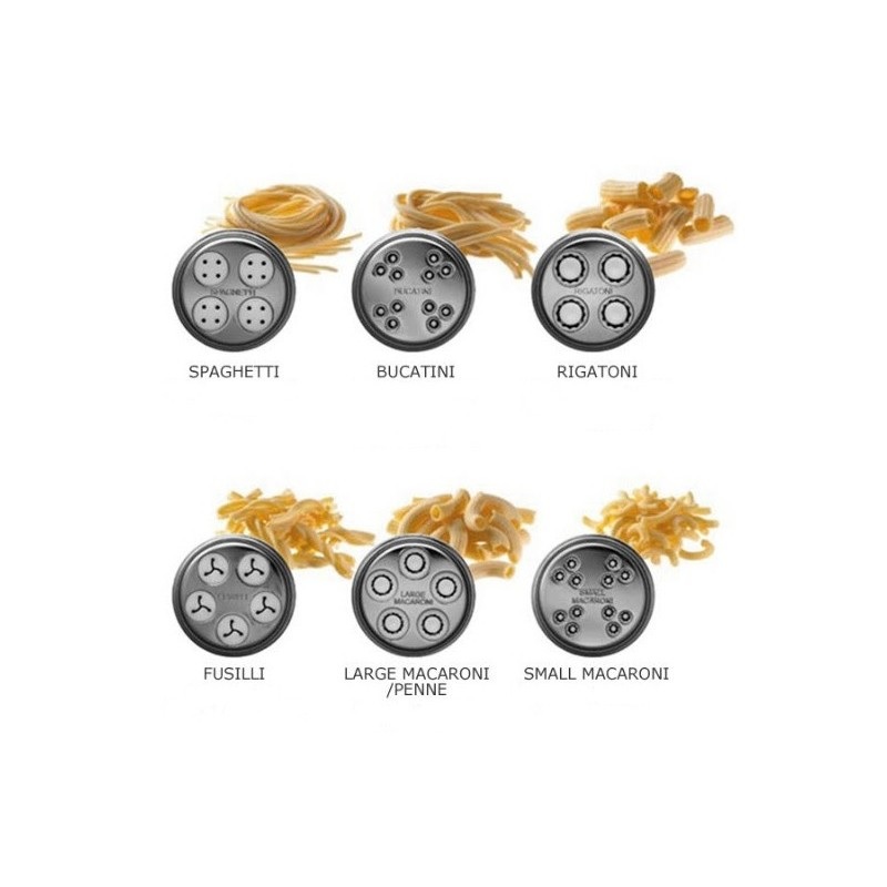 Výrobník těstovin příslušenství - matrice. Spaghetti, Bigoli, Linguine, Tagliolini, Tagliatelle, Cannelloni, Maccheroni, Gramigne, Creste, Gnocchetti, Cesarecce, Strozzapreti, Celentani, Fusilli, Trottole, Radiatory, Penne.