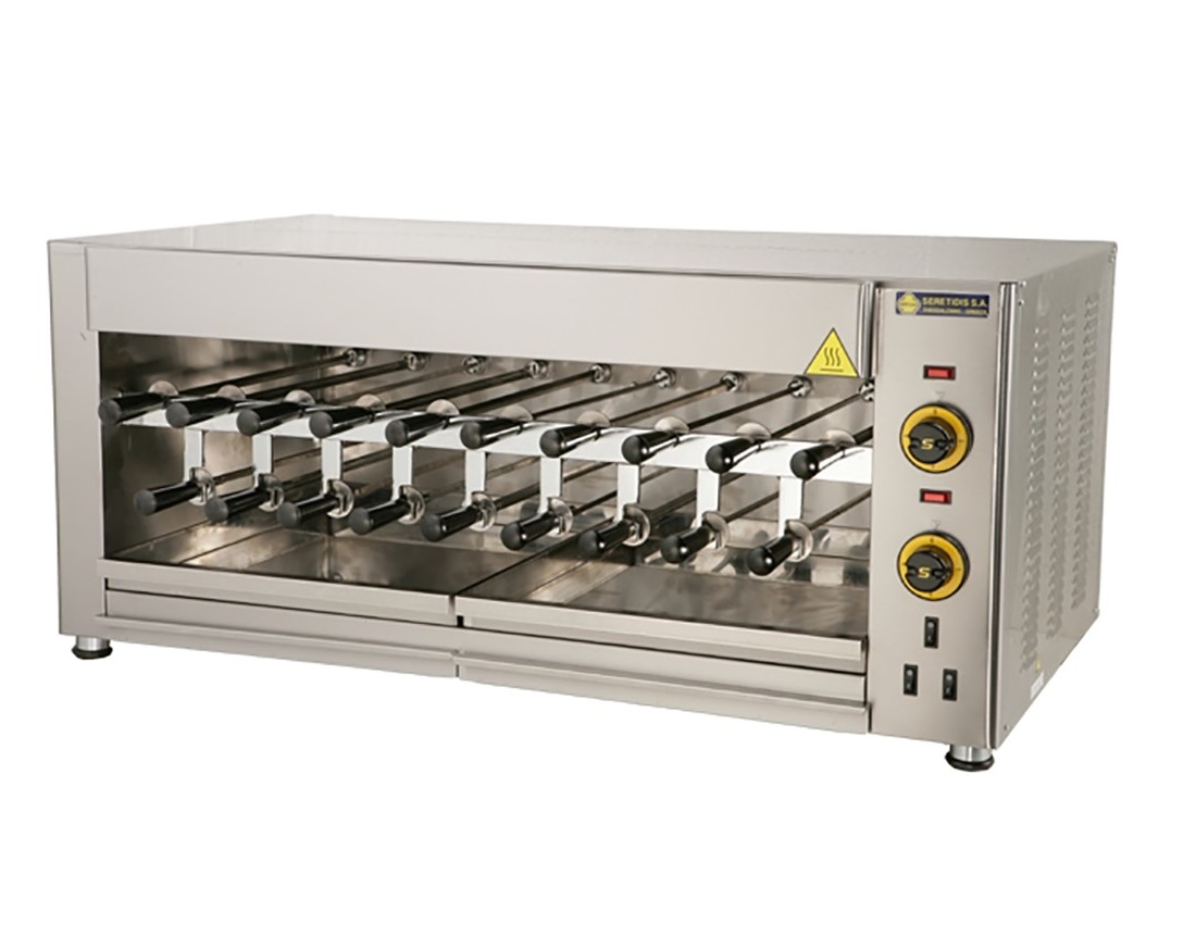 Profesionální churrasco gril - vhodné pro grilování špízů, díky dodávané mřížce lze použít i jako klasický gril. Hořáky jsou umístěny v horní části, takže nedochází k přepalování odkapávajícího tuku. 19 špízů.