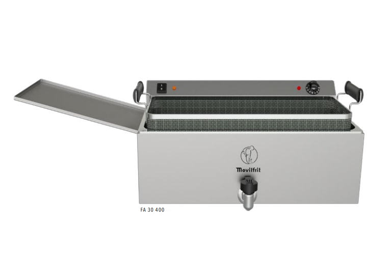 Stolní fritéza na přípravu koblih. Kompletně z nerezové oceli (AISI 304). Odnímatelná elektrická hlava (snadné čištění). Nastavitelný pracovní termostat. Protiskluzové nohy