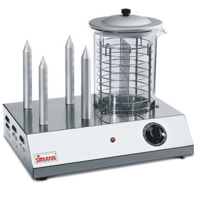 HOT DOG - celonerezové provedení. 4 trny. Zásobník z tvrzeného skla na udržování 30 párků v páře.