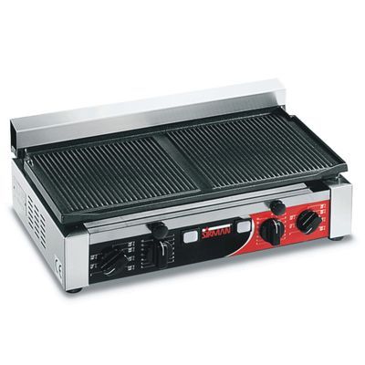 Profesionální kontaktní gril. Litinové desky potažené speciální keramikou, sleva za bezkeramické provedení (jen litina). Modely "TOP" bez horních desek, tedy jen plotna. Modely dvojité.