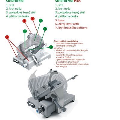 Hliníková slitina se speciálním keramicko-teflonovým povrchem, ideální při zpracovávání lepkavých produktů, excelentní klouzání produktů, a snadné čištění, vysoká odolnost vůči kyselinám a sanitačním chemikáliím, demontovatelné části lze bezpečně mýt v myčce, hliníková šedá barva. Upraven je stůl, kryt nože, pojezdový řezný stůl, přítlačná deska, báze, okraj krytu ostří, kryt brusného zařízení.