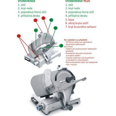 Hliníková slitina se speciálním keramicko-teflonovým povrchem, ideální při zpracovávání lepkavých produktů, excelentní klouzání produktů, a snadné čištění, vysoká odolnost vůči kyselinám a sanitačním chemikáliím, demontovatelné části lze bezpečně mýt v myčce, hliníková šedá barva. Upraven je stůl, kryt nože, pojezdový řezný stůl, přítlačná deska.