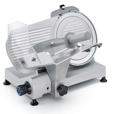 Profesionální nářezový stroj s hladkým nožem Sirman. Eloxovaný hliník. Provedení gravitační - šikmé, řemenový pohon. Vhodné pro snack bary, buffety, malé restaurace. Oddělené brusné zařízení.