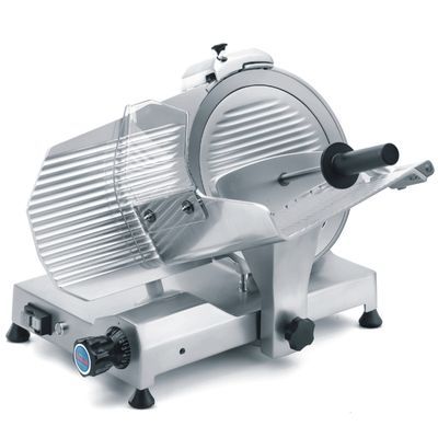 Profesionální nářezový stroj s hladkým nožem Sirman. Aluminiová slitina. Provedení gravitační - šikmé, řemenový pohon. S ventilovaným motorem - 60 min. chodu ve středních a velkých restauracích. Hliníkové držadlo.