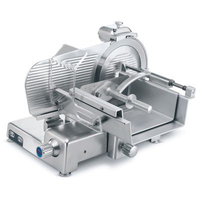 Profesionální nářezový stroj s hladkým nožem Sirman. Aluminiová slitina. Provedení vertikální - rovné, řemenový pohon. Vhodné pro velké restaurace, kantýny a supermarkety. VCS - dvojitý pojezdový řezný stůl určený pro syrové a čerstvé maso (steaky, carpaccio, lepkavé syrové maso). TOP nožky, madla a knoflíky vyrobeny z hliníkové slitiny; on-off tlačítka z nerezové oceli.