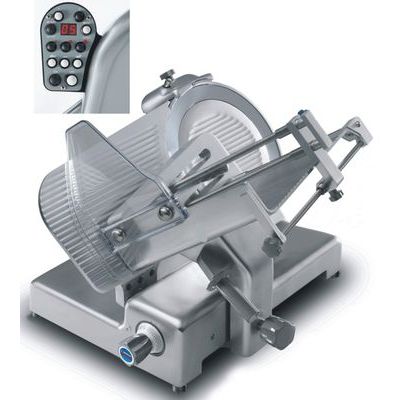 Profesionální nářezový stroj, aluminiová slitina, poloautomat, s hladkým nožem Sirman. Všechny modely mají počítadlo, 3 rychlosti 3 úrovně nastavení pojezdu, možnost i manuálního krájení. Všechny varianty mají Nettuno hopper, tedy řezný stůl, který umožňuje dokonalou fixaci a tlak krájeného produktu - výsledkem je pak vynikající kvalita řezání. Počítadlo - nastavení požadovaného počtu plátků s automatickým zastavením. Automatický posun stolu. Řemenový pohon. Zabudované brusné zařízení. Řezný stůl Nettuno umožňuje krájet uzeniny, syrové maso, sýr zeleninu - v ceně zařízení. Volitelné příslušenství za příplatek - povrchová úprava "STONEHENGE a STONEHENGE PLUS". Úprava "STONEHENGE" - hliníková slitina se speciálním keramicko-teflonovým povrchem, ideální při zpracovávání lepkavých produktů, excelentní klouzání produktů, a snadné čištění, vysoká odolnost vůči kyselinám a sanitačním chemikáliím, demontovatelné části lze bezpečně mýt v myčce, hliníková šedá barva. Provedení "STONEHENGE" - upraven je stůl, kryt nože, pojezdový řezný stůl, přítlačná deska. Provedení "STONEHENGE PLUS"- upraven je stůl, kryt nože, pojezdový řezný stůl, přítlačná deska, báze, okraj krytu ostří, kryt brusného zařízení.