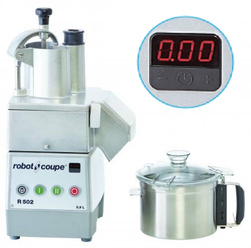 Kombinovaný robot - krouhač/kutr. výkonný robot vhodný pro použití ve větších provozech – v restauracích, bistrech, hotelech, školách a dalších s max. denní kapacitou do 300 porcí, kombinované zařízení umožňuje nasadit na stejný blok motoru jedno ze dvou funkčně rozdílných příslušenství, buď krouhací nástavec nebo nádobu kutru, na krouhacím nástavci lze plátkovat, strouhat, krájet na nudličky, kostičky a hranolky, v kutru lze sekat maso, zeleninu, mandle, oříšky, koření, připravovat majonézu, pyré, protlaky, pomazánky, stouhanku, hnětat těsto a jiné. MOTOROVÝ BLOK - indukční motor, asynchronní motor pro profesionální použití zaručující delší životnost a spolehlivost stroje; tichý chod motoru bez jakýchkoliv vibrací, motor nevyžaduje žádnou údržbu