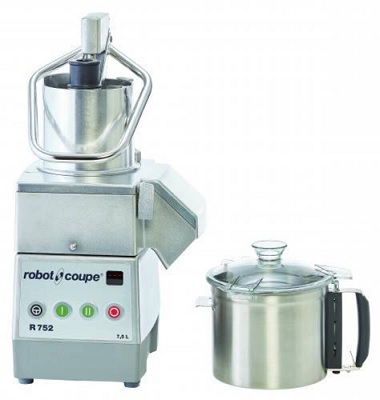 Kombinovaný robot - krouhač/kutr. výkonný robot vhodný pro použití ve větších provozech – v restauracích, bistrech, hotelech, školách a dalších s max. denní kapacitou do 400 porcí, kombinované zařízení umožňuje nasadit na stejný blok motoru jedno ze dvou funkčně rozdílných příslušenství, buď krouhací nástavec nebo nádobu kutru, na krouhacím nástavci lze plátkovat, strouhat, krájet na nudličky, kostičky a hranolky, v kutru lze sekat maso, zeleninu, mandle, oříšky, koření, připravovat majonézu, pyré, protlaky, pomazánky, stouhanku, hnětat těsto a jiné. MOTOROVÝ BLOK - indukční motor, asynchronní motor pro profesionální použití zaručující delší životnost a spolehlivost stroje; tichý chod motoru bez jakýchkoliv vibrací, motor nevyžaduje žádnou údržbu, nerezová hřídel, magnetický bezpečnostní systém, kdy brzda motoru zastaví zařízení při otevření víka nebo při zvednutí přítlačné páky, automatický restart, dvě regulace rychlosti, pulsní tlačítko pro lepší kontrolu konzistence a větší přesnost zpracování timer, kryt motorového bloku je kovový. NÁDOBA KUTRU - vybavena stíracím zařízením (stěrka nádoby a víka), odnímatelná nádoba z nerezu s držadlem, lze v ní sekat maso, zeleninu, mandle, oříšky, koření, připravovat majonézu, pyré, protlaky, pomazánky, strouhanku a hnětat těsto, průhledné polykarbonátové víko s otvorem umožňuje přidávání dalších ingrediencí v průběhu sekání. KROUHACÍ HLAVA - plátkuje, vlnkuje, strouhá, nudličkuje, kostičkuje, hranolkuje, kovová odnímatelná nádoba a víko se 2 násypnými otvory: