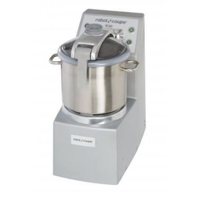 Profesionální vertikální kutr R 20 k postavení na zem umožňující zpracování masa, zeleniny a ovoce od hrubého rozsekání po nejjemnější kvalitu, přípravu paštik, majonéz, pyré, pomazánek a strouhanky, rovněž k drcení ořechů a mandlí a hnětení těsta. Vhodné do provozu s max. denní kapacitou do 300 porcí. Zařízení je vybaveno motorovou brzdou, magnetickou pojistkou, zajišťující při nesprávném sesazení zařízení nebo v momentu otevření víka zastavení poř. nespuštění kutru a pulsním tlačítkem, které dovoluje větší přesnost zpracování. Díky průhlednému víku nádoby s otvorem lze přidávat za chodu další ingredience. Doobjednat lze nůž s hrubě zubatým nebo jemně zubatým ostřím. Při zpracování menšího množství lze demontovat horní ostří nože a regulovat výšku spodního ostří. Nůž s rovným ostřím - emulse, pěny, jemné rozsekání masa a zeleniny, nůž s hrubým ostřím - hnětení, sekání oříšků, mandlí, pro zmrzlé potraviny a ostatní tvrdé potraviny, nůž s jemným ostřím - nejjemnější zpracování, sekání zeleného koření.