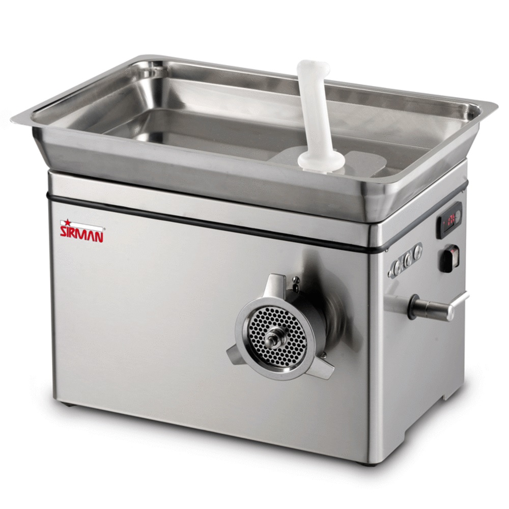 Profesionální mlýnek na maso. Určen pro vysokou zátěž do nepřetržitého provozu. Složení mlecí hlavy: enterprise – (1× nůž, 1× šajba). Chlazená mlecí hlava a podávací hrdlo. Výkonný izolovaný ventilovaný motor. Podávací otvor vybaven bezpečnostním blokováním. Šnekový pohon. Krytí IP 54. Ovládací panel s napětím 24V. Nerezové tělo i hlava. Standardní vybavení: šajba 6 mm, mlecí hlava ENTERPRISE. Lze doobjednat: šajby 2; 3; 3,5; 6; 8 mm, 1/2 unger, Total unger, plnička, zařízení na hamburgery.