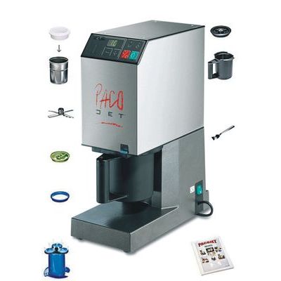 Pacojet - profesionální stroj na přípravu sorbetů, zmrzliny, bylinkových nebo kořenících koncentrátů pro omáčky, vzdušné pěny …. Kapacita nádob 1 lit, max. plnění 0.8 litru, průměr 13 cm, výška 13.5 cm, ideální teplota -20°C, rotace ostří 2000 Ot/min., tlak vzduchu 1.2 barů.