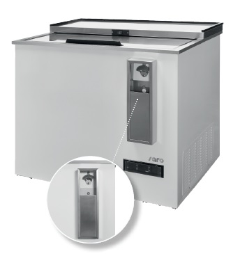 Profesionální box na láhve. Izolované posuvné víko. Otvírák na láhve se sběrnou nádobou. 4 kola (2 s brzdou). Uzamykatelné. Digitální regulace teploty (DIXELL). Izolace: 40 mm. Automatické odmrazování. Chladivo: R600a.