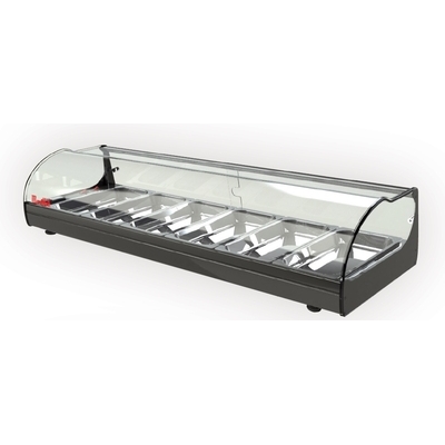 Profesionální stolní vitrína - provedení eloxovaný hliník. Oblé tvrzené sklo. Led osvětlení. Digitální nastavení teploty. Rošt o kapacitě 8 x GN 1/3.Oddělený agregát na kabelu.