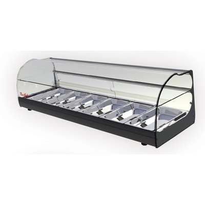 Profesionální dvoupatrová stolní vitrína - provedení eloxovaný hliník. Oblé tvrzené sklo. Led osvětlení. Digitální nastavení teploty. Rošt o kapacitě 6 x GN 1/3.Oddělený agregát na kabelu.