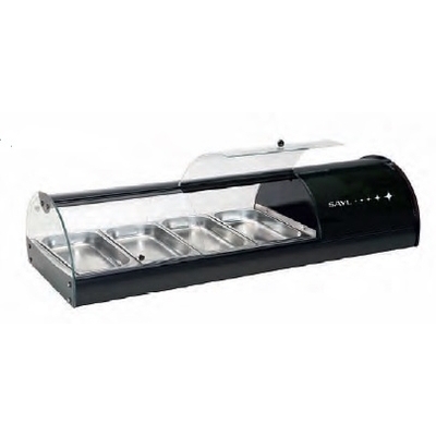 Profesionální stolní vitrína samoobslužná - černá. Snadné čištění. Výklopné dveře skleněné odolné proti úderu a otěru. Konzervace potravin mezi 1 ° C a 5 ° C v "potravinové zóně ". Ekologické chladivo R - 134A CFC -free, a vstřikovaná polyuretanová izolace bez CFC. Tichý kompresor Danfoss. Nastavitelné nohy. Kapacita 4 x 1/3-40 GN .