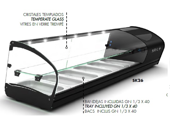 Profesionální stolní vitrína dvoupatrová. První patro chlazené, druhé neutrální. Oblé tvrzené sklo. Led osvětlení. Digitální nastavení teploty. Kapacita 6 x GN 1/3 - 40.