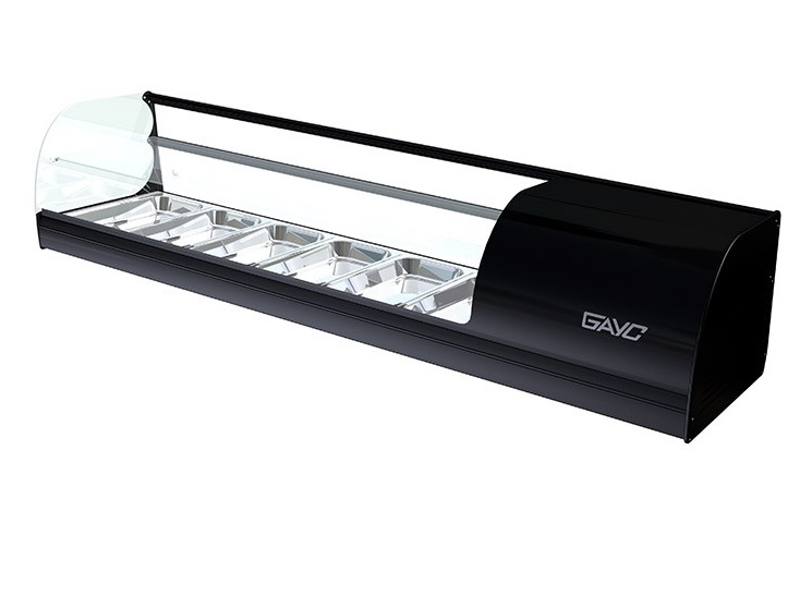 Profesionální stolní vitrína - provedení eloxovaný hliník. Oblé tvrzené sklo. Digitální nastavení teploty. Kapacita 6 x GN 1/3 - 40. LED osvětlení. 2 patra.