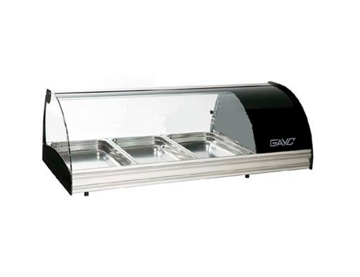 Profesionální stolní vitrína - provedení eloxovaný hliník. Oblé tvrzené sklo. Digitální nastavení teploty. Kapacita 3 x GN 1/1 - 40. LED osvětlení.