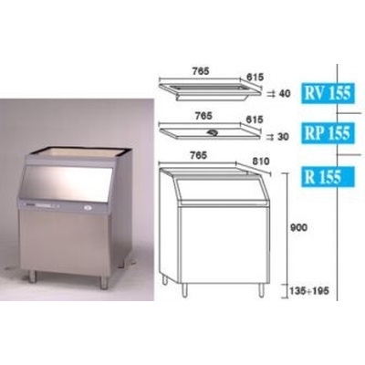 Zásobník na led k modelům SV 225, SV 325, SV 395, SV 545, s kapacitou 150 kg výška zásobníku uvedená v parametrech je bez nastavitelných nohou 135–195 mm, nerezové provedení pláště, isolace polyuretanovou pěnou o tloušťce 40 mm, vnitřek zásobníku polyethylenu. RV 155 - horní část zásobníku R 155 k modelům SV - 6 710 Kč. RP 155 - horní část zásobníku R 155 k modelům SP - 6 120 Kč.
