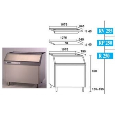 Zásobník na led k modelům SV 225, SV 325, SV 395, SV 545, s kapacitou 243 kg výška zásobníku uvedená v parametrech je bez nastavitelných nohou 135–195 mm, nerezové provedení pláště, isolace polyuretanovou pěnou o tloušťce 40 mm, vnitřek zásobníku polyethylenu. RV 250 - horní část zásobníku R 250 k modelům SV - 7 540 Kč. RP 250 - horní část zásobníku R 250 k modelům SP - 6 860 Kč.