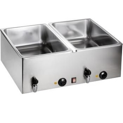 Vodní lázeň - pro 2 x GN 1/1 nebo 4 x 1/2 nebo 6 x 1/3. Nádoby s maximální hloubkou 150 mm. Termostat do 100 °C. Výpustný kohout.