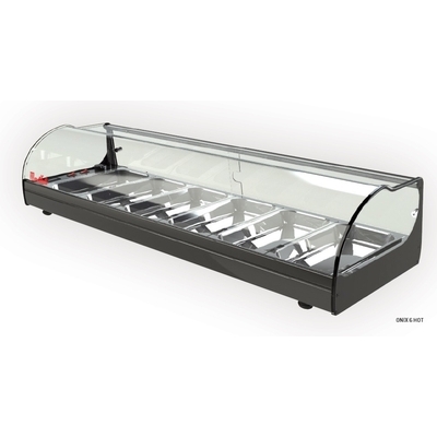 Profesionální stolní vyhřívaná vitrína - provedení eloxovaný hliník. Oblé tvrzené sklo. Led osvětlení. Manuální nastavení teploty. Vypouštěcí ventil. Kapacita 4 x GN 1/3 - 40.