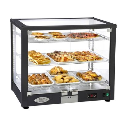 Profesionální samoobslužná stolní vitrína - černá. Určena speciálně pro snack bary, pivnice, pekařství, čajovny, atd. Elektricky vyhřívaná vitrína na quiche, pizzy, croissanty, buchty, zákusky, sýr nebo vepřové pusinky apod. Se zvlhčováním (nádobka na vodu). Kapacita: 3× GN 1/1 nebo 3 tácy 400×600 mm. 2 dvířka (úhel až 180°) na zadní straně. S LED osvětlením. Termostat – regulace teploty 20 – 90 °C. Vypínač ON/OFF, kontrolka, přepínač pro ventilaci. Snadné čištění a údržba: zcela odnímatelné rošty, držáky rošů, spodní tác a nádoba na vodu.