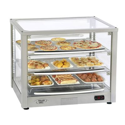 Profesionální samoobslužná stolní vitrína - nerezová. Určena speciálně pro snack bary, pivnice, pekařství, čajovny, atd. Elektricky vyhřívaná vitrína na quiche, pizzy, croissanty, buchty, zákusky, sýr nebo vepřové pusinky apod. Se zvlhčováním (nádobka na vodu). Kapacita: 3× GN 1/1 nebo 3 tácy 400×600 mm. 2 dvířka (úhel až 180°) na zadní straně. S LED osvětlením. Termostat – regulace teploty 20 – 90 °C. Vypínač ON/OFF, kontrolka, přepínač pro ventilaci. Snadné čištění a údržba: zcela odnímatelné rošty, držáky rošů, spodní tác a nádoba na vodu.