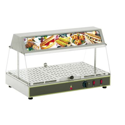 Profesionální samoobslužná stolní vitrína - nerezová nebo zlatá. Vhodná na výdejní pult nebo do samoobslužného prodeje. Elektricky vyhřívaná vitrína na pekárenské výrobky (pečivo, koláče, croiassanty/, pizzu, maso apod. Se zvlhčováním (nádobka na vodu). Kompatibilní s GN 1/1, hloubka 25 mm. Dvířka z plexiskla ze strany obsluhy a ze strany zákazníka. S osvětlením. Termostat – regulace teploty 20 – 95 °C. Vypínač ON/OFF, kontrolka. Vyjímatelný nerezový tác, výškově nastavitelné nožičky. Dodáváno bez GN a s obrazovým menu.