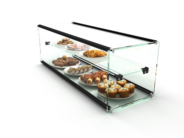 Profesionální neutrální obslužná vitrína - určeno pro skladování potravin a prezentaci, vhodné pro všechny gastronomické provozy. Dvě patra. Bez osvětlení.