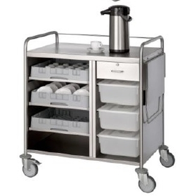 Vozíky k transportu nádob se 4 otočnými kolečky z toho 2 brzděné. Fixační úchyty pro nádoby a boční sklápěcí desky s držákem pro pytle na odpad. Čtyři zásuny na standardní koše na nádobí 500x500 mm a gastronádoby (nejsou v ceně). Provedení z nerezové oceli.