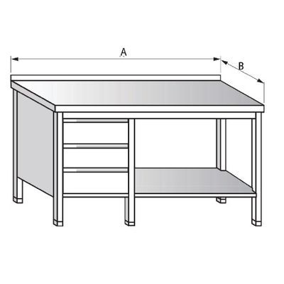 Stůl nerezový s policí a zásuvkovým blokem - tuhá celonerezová konstrukce se sendvičově provedenou vrchní deskou a zadním lemem v=40 mm. Nohy JEKL (40x40 mm), výškově stavitelné. Základní výška stolu je 850 mm. Na objednávku výška 900 mm bez příplatku.