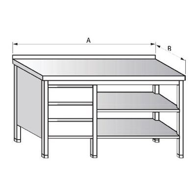 Stůl nerezový s 2 x policí a zásuvkovým blokem - tuhá celonerezová konstrukce se sendvičově provedenou vrchní deskou a zadním lemem v=40 mm. Nohy JEKL (40x40 mm), výškově stavitelné. Základní výška stolu je 850 mm. Na objednávku výška 900 mm bez příplatku.