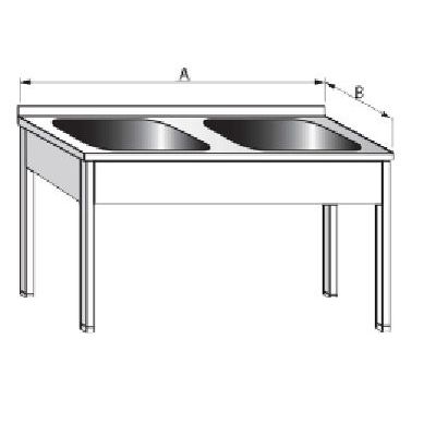 Stůl se dvěma dřezy 400x400x250 - celonerezové provedení s vevařeným lisovaným dřezem, opláštěním čela, boků. Síla materiálu 1mm. Zadní lem vysoký 40mm. Stavitelné jeklové nohy (40 x 40) jsou umístěny 15 mm od hran stolu a v rovině se zadní stranou.